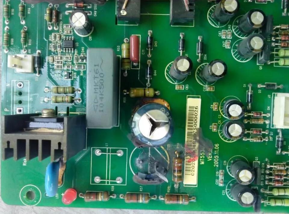 驅動板上開關電源回路電解電容炸開,直流母線輸入線,插座端子燒毀。