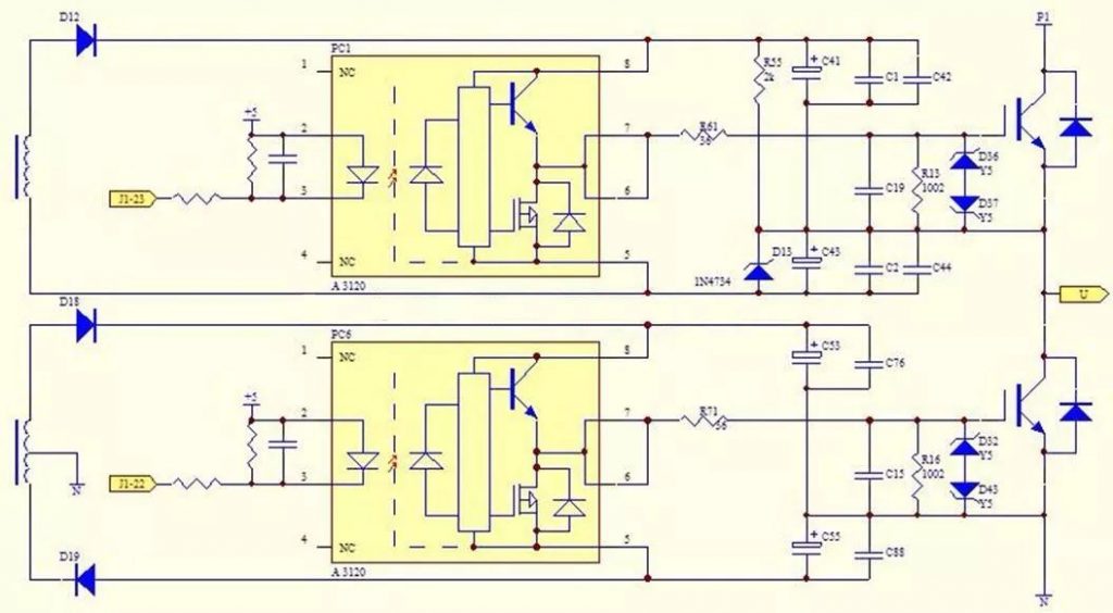 上圖是某變頻器的驅(qū)動(dòng)電路U相電路圖,V、W相電路相同。從中可以看出,驅(qū)動(dòng)電路的上下臂工作電源由兩組彼此隔離的電源組成,其中開關(guān)變壓器的一個(gè)繞組、D12、C41、C42、C43、C44、穩(wěn)壓二極管D13一起構(gòu)成上臂驅(qū)動(dòng)電路的工作電源,光耦PC1-A3120的8腳和5腳之間電壓為+20VDC,以上臂的IGBT的E極(即U相)為參考點(diǎn),8腳和E之間的電壓為+15V,5腳和E之間電壓為-5V。