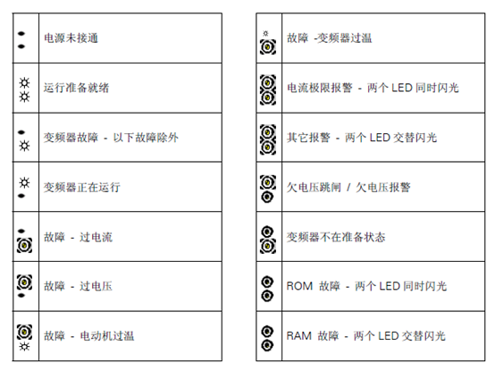 西門子變頻器的上,下兩個ALM指示燈有四種狀態(tài),分別是燈滅,長亮,快速閃爍,和閃爍,分別代下以下含義: