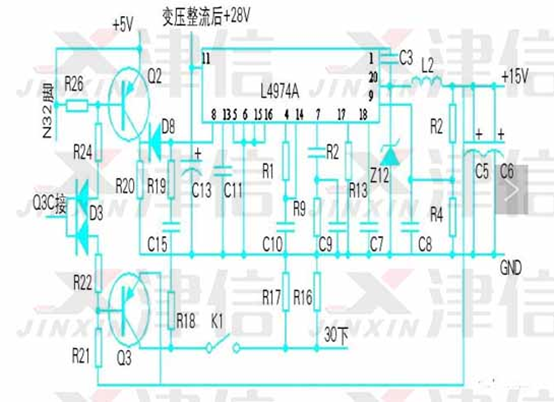 - 測(cè)試芯片L4974A 輸出電壓15V為0V,查芯片8腳軟啟動(dòng)電壓是0.5V,正常值為3.85V,所以芯片L4974A的8腳輸入電壓不對(duì)。經(jīng)查Q2輸入觸發(fā)電壓正常。