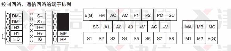 - 控制回路端子+V,-V電壓的輸出電流容量最大為20mA。請勿使控制回路端子+V,-V間短路。否則將會導致誤動作或故障。